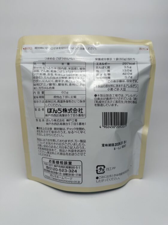 Tsumameru Gobou Senbei is a unique Japanese rice cracker, made with the earthy aroma of burdock root (gobou) and finished with a zesty, mildly spicy salad seasoning. It was first released by Bonchi in February 2024.