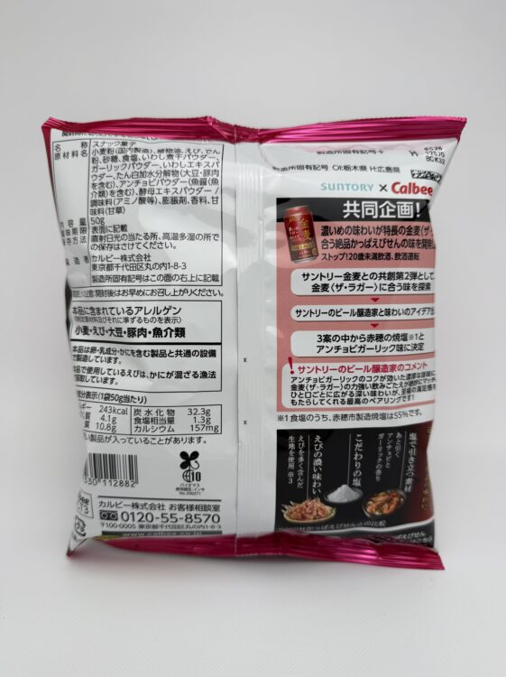 Zeppin Kappa Ebisen Ako Yaki Shio to Anchovy Garlic is a bold, sophisticated limited-edition snack from Calbee, co-developed with Suntory to pair perfectly with their Kinmugi The Lager beer. Part of the premium Zeppin Kappa Ebisen series, which features a larger, firmer cracker with a richer, more concentrated shrimp flavor than standard Kappa Ebisen, this variety is crafted for grown-up snacking at its finest.