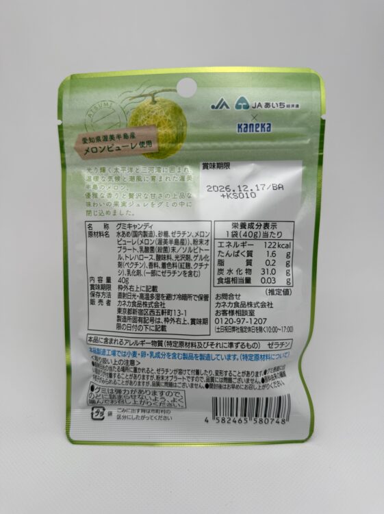 Atsumi Melon Gummy is a premium Japanese gummy candy featuring melon juice jelly made from melons grown in the Atsumi Peninsula. It is produced by Kaneka. Each piece captures the elegant aroma and refined sweetness of high-quality melon in a soft and flavorful gummy.