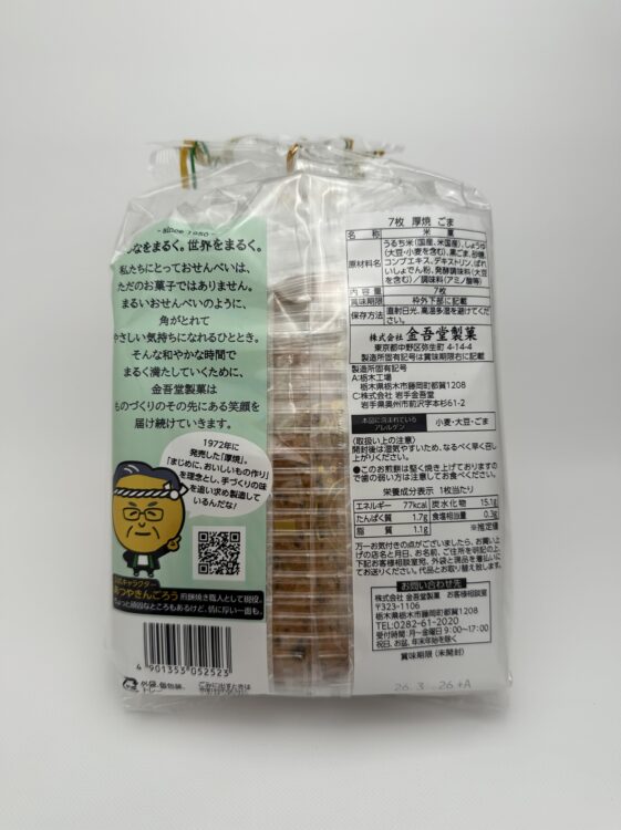 Thick Sesame Rice Crackers are a hearty, traditional Japanese senbei made with a generous amount of roasted black sesame seeds kneaded into the dough. They are released by Kingodo. Each cracker is baked thick for a firm, satisfying crunch, and the sesame seeds give it a rich nutty aroma and deep, toasty flavor.
