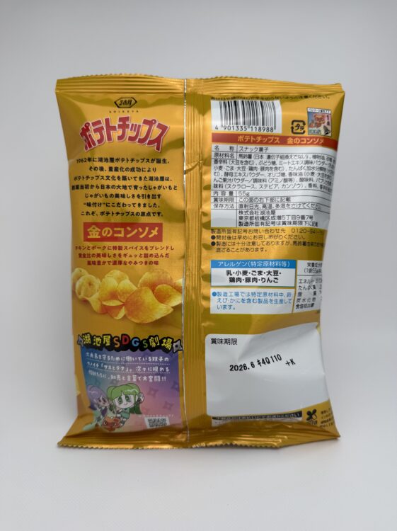 Potato Chips Gold Consomme are premium Japanese potato chips featuring a deep, rich consomme flavor. It is released by Koikeya. Made with carefully selected potatoes, these chips are seasoned with a luxurious blend of beef and vegetable umami, herbs, and spices to create a bold yet refined taste.