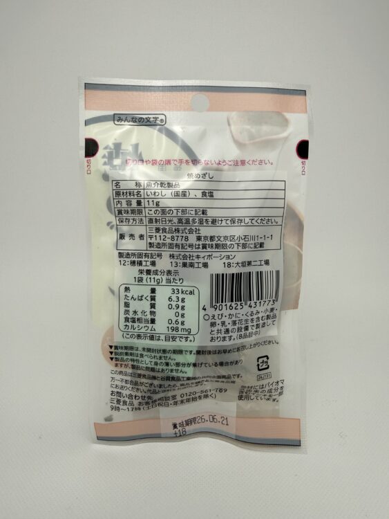 Grilled Dried Sardines are a traditional Japanese seafood snack made from domestically sourced sardines. They are produced by Mitsubishi Shokuhin. The sardines are simply seasoned with salt and carefully grilled to bring out their natural flavor.