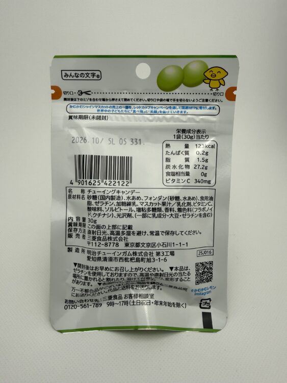Each piece contains vitamin C equivalent to 10 grapes and features a unique triple-layer structure that changes in taste and texture as you chew: a lightly sweet soft coating, a gently fruity outer layer with a smooth melt-in-the-mouth feel, and a soft chewy center with rich grape flavor.