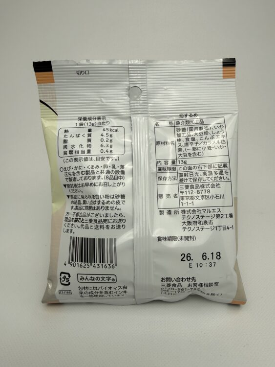 Koi Surume is a flavorful dried squid snack made using only the body portion of the squid. It is produced by Mitsubishi Shokuhin. Carefully prepared and pressed into a thin sheet, this “noshi ika” style snack offers a pleasantly chewy texture that highlights the natural umami of squid.