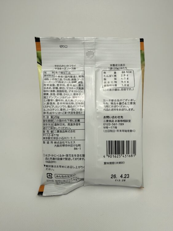 Soft Fried Squid Mayonnaise is a savory Japanese snack made using only the body portion of dried squid. It is produced by Mitsubishi Shokuhin. The squid is lightly fried to create a tender texture while maintaining its rich seafood flavor.