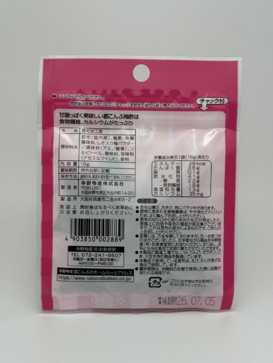 Miyako Kombu Ume Vinegar Kelp Snack Pouch is a classic Japanese snack made from domestically sourced kelp, seasoned with a refreshing ume vinegar flavor. It is released by Nakano. The tangy and slightly fruity acidity of ume (Japanese plum) enhances the natural umami of the kombu.