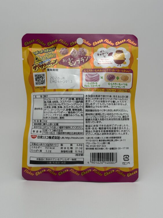 Choco Flakes Saku Saku Pop Sweet Potato Mont Blanc is inspired by the Japanese style sweet potato dessert Mont Blanc. It is created by Nissin. Thin baked corn flakes and crispy purple sweet potato flavored puffs are coated in smooth purple sweet potato flavored chocolate.