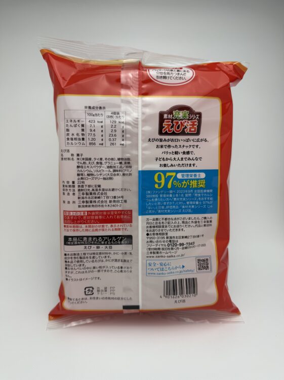 In addition to its appealing flavor, Ebikatsu is enriched with calcium. Each four-pack serving (8 crackers) contains the equivalent calcium of one cup of milk (200ml), making it a convenient snack option for those mindful of their daily intake.
