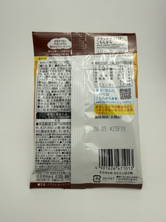 Mochicure Mitarashi Dango is a Japanese-style soft gummy made with rice flour, featuring a tender mochi-like texture that feels smooth and slightly chewy like traditional dango dumplings. It is produced by Sanko Seika.