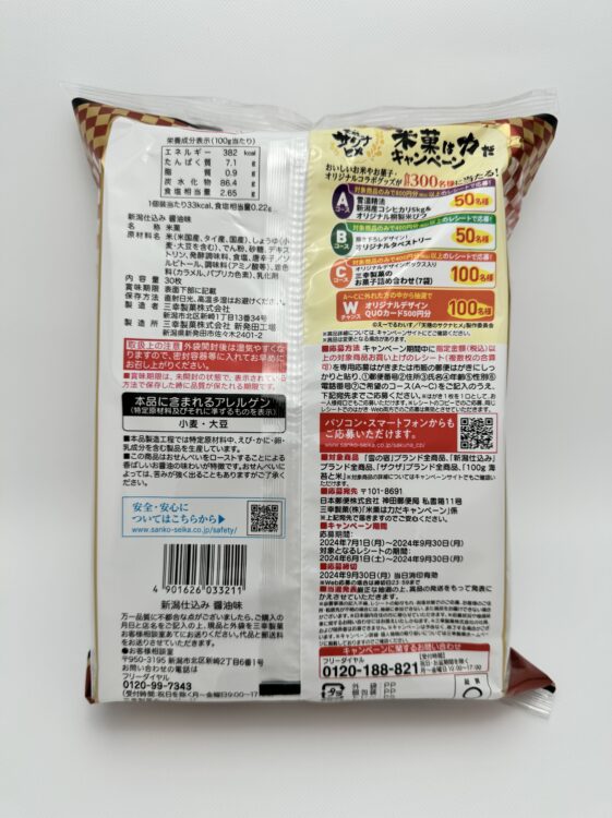 Niigata Shikomi Soy Sauce is traditional Japanese rice crackers made using a slow-resting method inspired by Niigata’s senbei-making tradition. It is produced by Sanko Seika. This careful process enhances the aroma and depth of flavor, resulting in a crisp texture and a rich, satisfying taste.