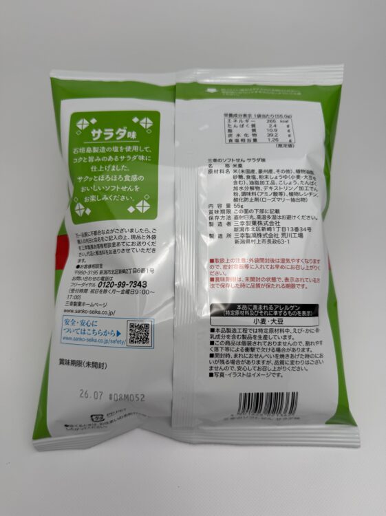 Soft Senbei Salad is a light and delicately textured Japanese rice cracker made for those who enjoy a gentle crunch and refined seasoning. It is produced by Sanko Seika. Carefully seasoned with sea salt produced in Ishigaki Island, Japan, this snack delivers a rich yet balanced savory “salad” flavor that enhances the natural taste of rice.