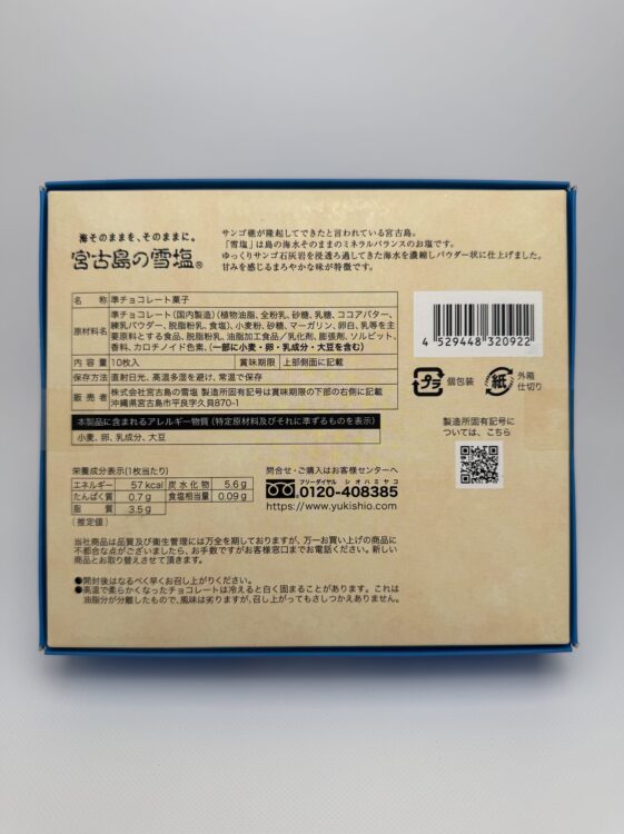 Yukishio Langue de Chat is a popular Okinawan souvenir sweet, made with the famous Yukishio (snow salt) from Miyakojima, Okinawa. It is produced by Yukishio Kabo.  This elegant cookie is widely enjoyed as a representative Okinawa omiyage, loved by both locals and visitors.